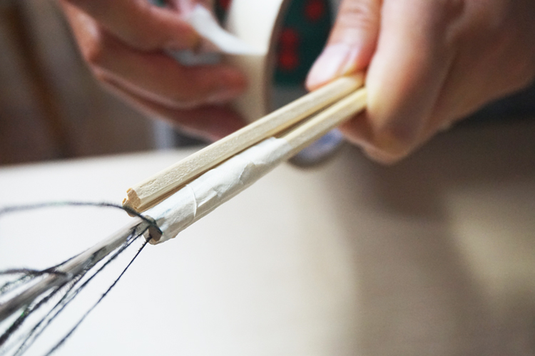 4. 나무젓가락과 깃털이 끼워진 와이어를 종이테이프를 이용해 이어줍니다. 와이어를 나무젓가락 이음매 사이에 올려 놓고, 종이테이프로 젖가락 전체를 나선형을 그리듯 각도를 약간 틀어 돌돌 말아 붙여줍니다. 그러나 처음에는 같은 각도로 돌려 붙여서 두 개를 단단히 고정시키는 게 중요합니다. 그리고 일반 opp 테이프를 붙이면 끈적거림이 있을 수 있으니, 가능한 종이테이프를 씁니다.