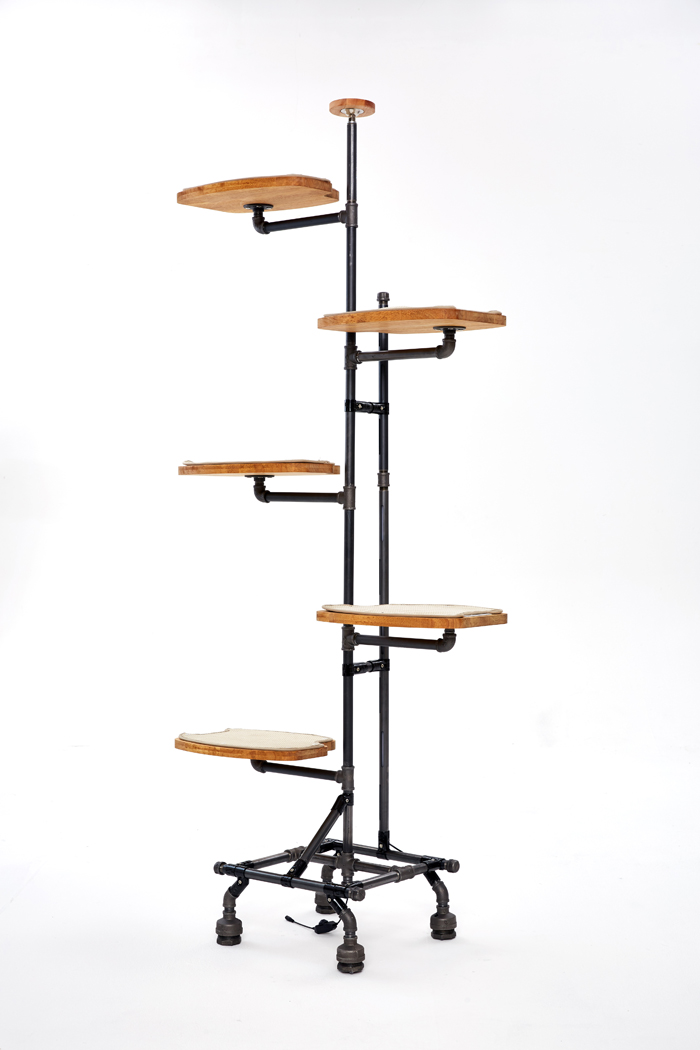 빈티지 인더스트리얼 인테리어를 완성하는 캣타워가 등장했다. 분체 도장된 20 A(27mm) 배관 파이프로 기둥을 세우고 친환경등급의 고무나무 집성목으로 발판을 만들었다. 배관과 배관 간 연결 부위는 실제 물이나 가스의 방향을 바꿀 때 쓰는 관이음 기계요소 엘보(elbow)로 이었다. 또 캣타워 꼭대기에는 LED 에디슨 전구를 달아 인더스트리얼 가구의 정점을 찍었다.